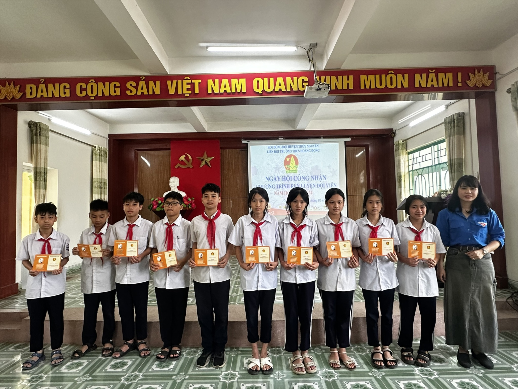 Thực hiện chương trình công tác Đội và phong trào thiếu nhi năm học 2023-2024 của Ban thường vụ Huyện Đoàn Thủy Nguyên. Được sự chỉ đạo, hướng dẫn của Hội đồng Đội về việc tổ chức " Ngày hội công nhận chương trình rèn luyện Đội viên". Hòa cùng niềm vui chung của cả nước, thi đua lập nhiều thành tích hướng tới kỷ niệm 83 năm ngày thành lập Đội (15/05/1941-15/05/2024); 134 năm ngày sinh nhật Bác. Sáng ngày 11/5/2024, Liên đội trường THCS Hoàng Động long trọng tổ chức ngày hội công nhận hoàn thành chương trình Rèn luyện Đội viên cho các em học sinh, đội viên theo từng hạng: Hạng sẵn sàng cho Đội viên lớp 7, hạng trưởng thành cho Đội viên lớp 9.