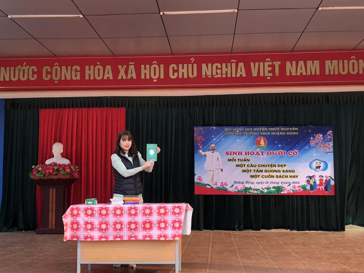Thực hiện Chương trình công tác Đội và phong trào thiếu nhi năm học 2023 – 2024 của Ban thường vụ Huyện đoàn Thủy Nguyên. Ngay từ đầu năm học Liên đội THCS Hoàng Động đã chủ động hướng dẫn BCH Liên đội đổi mới hình thức sinh hoạt Liên đội dưới cờ theo mô hình "Mỗi tuần một câu chuyện đẹp, một cuốn sách hay, một tấm gương sáng". Với các hình thức đa dạng, phong phú như: Đọc sách mỗi ngày, mỗi tuần lựa chọn một cuốn sách hay chia sẻ về nội dung, ý nghĩa vào các tiết sinh hoạt lớp; Tuyên truyền giới thiệu mỗi tháng một cuốn sách hay tới toàn Liên đội vào tiết Sinh hoạt dưới cờ; Tuyên dương các tấm gương sáng, tiêu biểu của đội viên có thành tích trong học tập, các hoạt động phong trào, tấm gương người tốt việc tốt. Qua những buổi sinh hoạt chuyên đề, giúp cho các em đội viên có thêm động lực, tinh thần tương thân tương ái, biết sẻ chia với các bạn cùng lớp, cùng trường, nhất là các bạn có những hoàn cảnh khó khăn; xây dựng cho các em tinh thần tự học, rèn luyện những đức tính tốt, tinh thần đoàn kết và làm theo 05 điều Bác Hồ dạy. Qua đó tiếp tục làm tốt công tác giáo dục của tổ chức Đội đối với các em đội viên trong trường học.