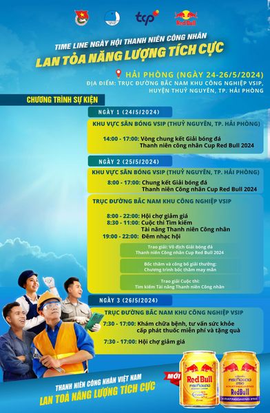 Chuỗi chương trình do TW Hội LHTN Việt Nam phối hợp cùng Công ty TCP Việt Nam – Nhãn hàng Red Bull tổ chức dành riêng cho thanh niên Công nhân Việt Nam với những hoạt động hấp dẫn: Giải bóng đá Cup Red Bull, đêm nhạc hội Thanh niên công nhân, hội chợ giảm giá, khám chữa bệnh, cấp phát thuốc miễn phí cho thanh niên công nhân